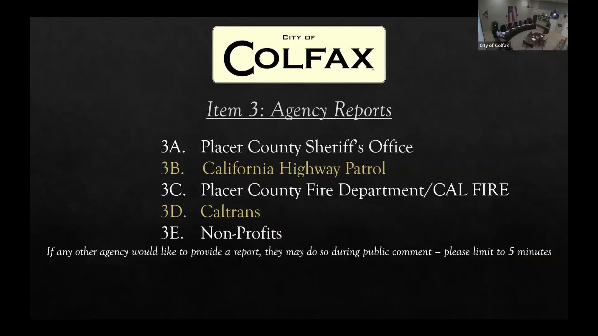 At the same meeting, California Highway Patrol public information officer Jason Lyman introduced Lieutenant Gil Kinney as the new commander for the Gold Run CHP area. Kinney said his priorities include reducing fatal and serious‑injury crashes on Interstate 80 and working with the community to reduce crime. Lyman reported local CHP statistics for January — 604 citations, 410 warnings and 17 arrests (14 related to DUI) — and warned officials that a large storm was forecast for the coming week that could produce heavy snow in the Blue Canyon area and substantial freeway delays.