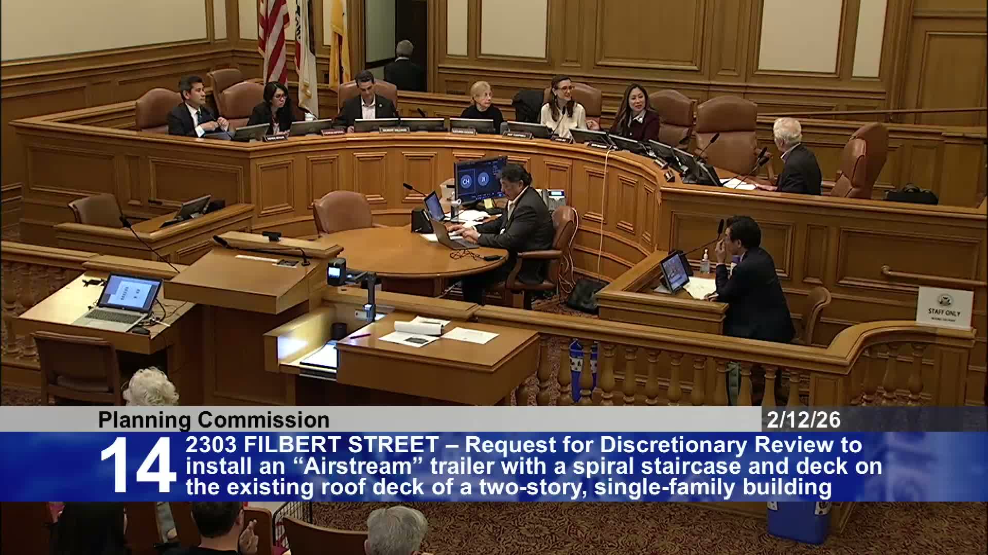 A contentious discretionary review at 2303 Filbert Street dominated the Feb. 12 meeting as staff, neighbors and the sponsor debated a revised rooftop design that replaces a previously permitted greenhouse with a prefabricated Airstream trailer, spiral stair, catwalk and associated deck features.