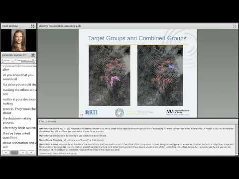 Heidi Eldridge presented preliminary results showing substantial variability among latent fingerprint examiners and described a prototype multi-scale assessment tool; she announced a new NIJ grant to replicate black-box methods for palm comparisons and called for partners to validate the tool in casework.