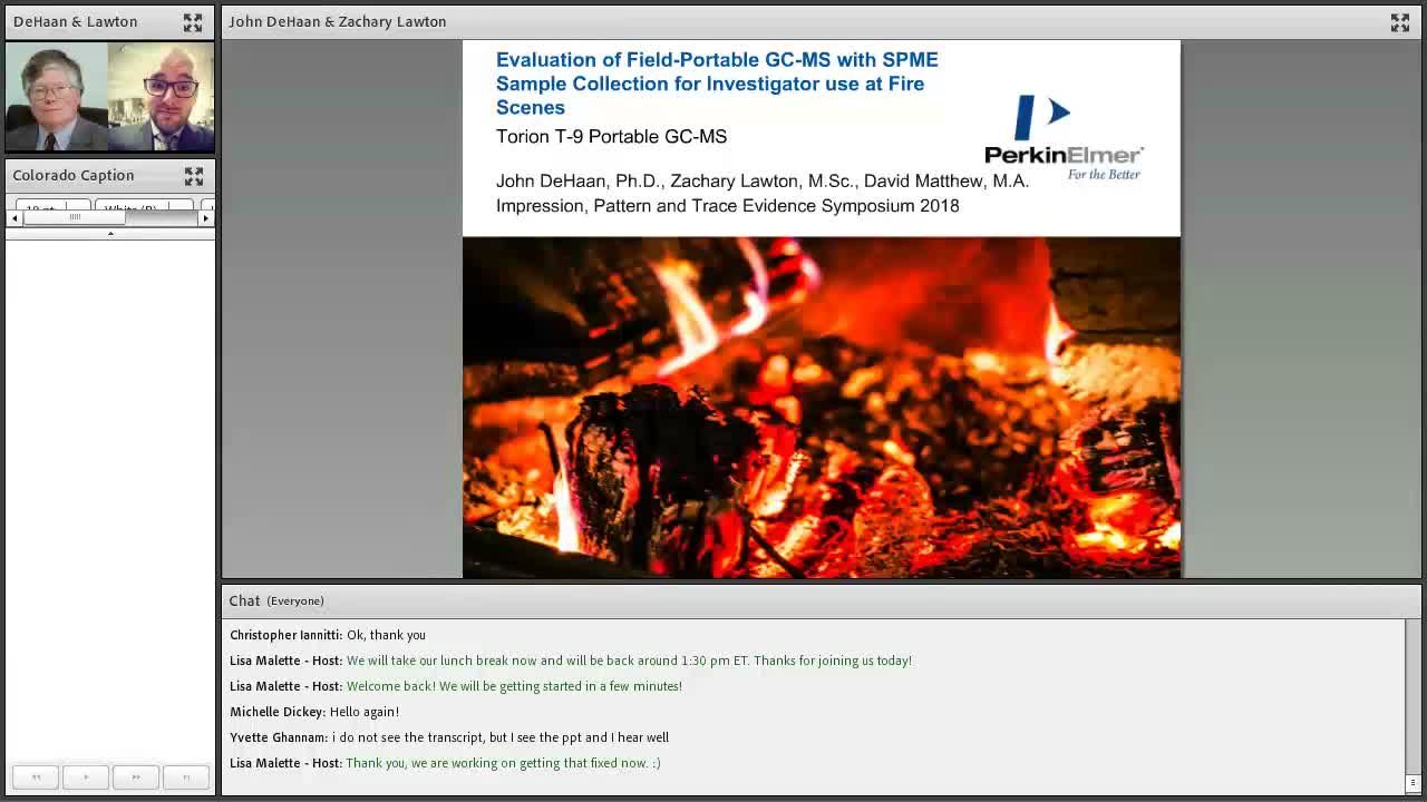 Dr. John DeHaan presented test results showing portable gas chromatography–mass spectrometry (GC‑MS) with SPME sampling can detect common ignitable liquids — including gasoline, diesel, E85 and kerosene — in as little as three minutes and correlate closely with laboratory GC‑MS results, though limitations remain.