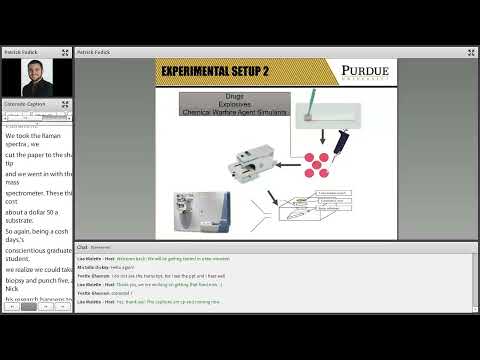 A presenter described lab work pairing surface-enhanced Raman spectroscopy with paper-spray mass spectrometry to produce dual, corroborating signatures from a single substrate — an approach meant to speed in‑field identification of drugs, explosives and chemical-agent simulants while addressing laboratory backlogs.