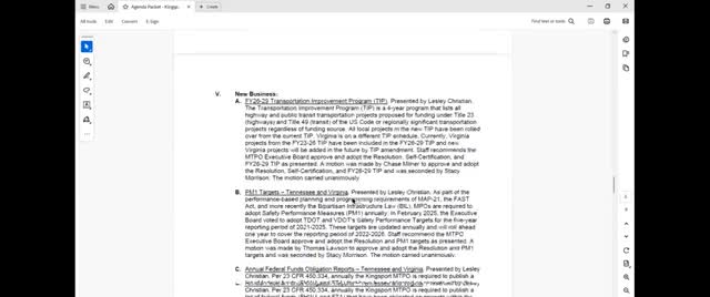 Jim Meyer of AECOM told the board the LRTP is a federally required, multimodal plan updated every five years and will guide regional transportation investments through 2050. He said the schedule calls for draft memos and appendices this year, a full draft plan by October, submission to TDOT and VDOT in mid-December, FHWA and FTA review in February, a 30-day public review in March–April and formal adoption at the MPO meeting in May 2027. Meyer asked jurisdictions to forward recent planning studies and updated project costs to MPO staff (Leslie, Michael) to inform the plan’s needs and opportunities analysis.