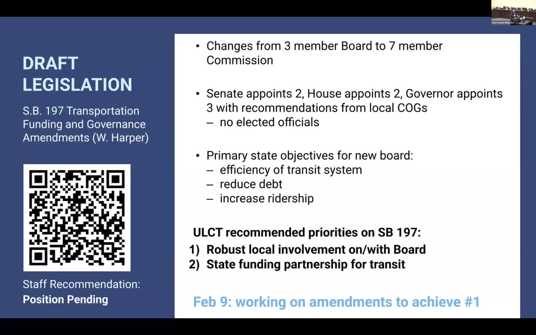 Next steps: staff will collect priority responses from cities on UTA governance and specific rail and towing provisions, and will follow up with jurisdictions affected by proposed lane-width or tiering language. The Senate president signaled additional bills on initiatives forthcoming from the legislature.