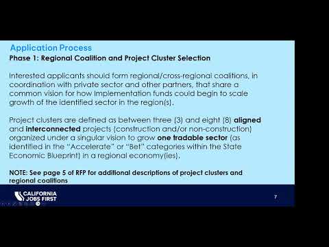 Derek Kirk, senior advisor for economic policy at the Governor’s Office of Business and Economic Development (GoBiz), told webinar participants that GoBiz, in partnership with the Employment Development Department and the Labor Agency, is making approximately $45,000,000 available for Round 2 of the Regional Investment Initiative implementation grants under the Jobs First initiative.