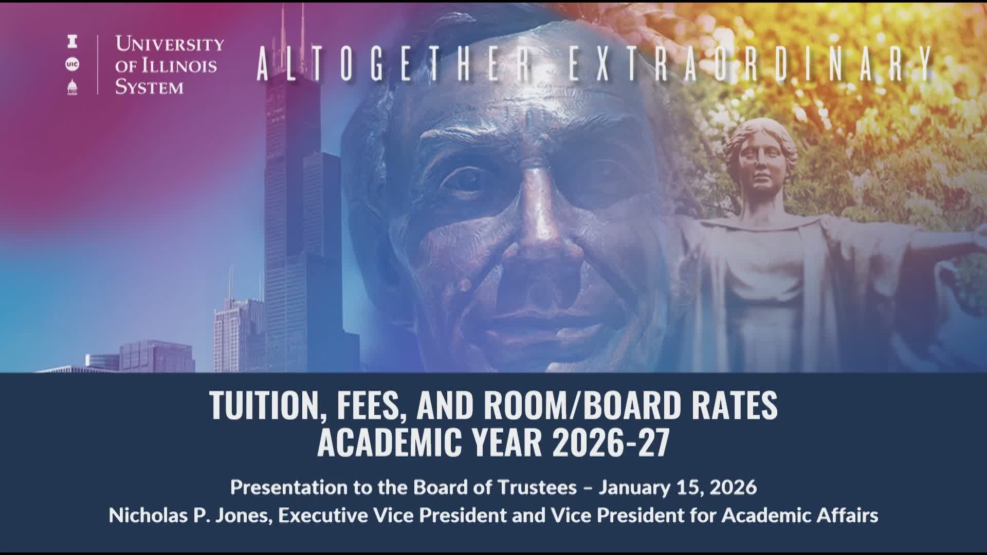 The University of Illinois Board of Trustees approved tuition, student-fee and residence-hall rate recommendations for academic year 2026–27 after a detailed presentation by Vice President Nicholas Jones.