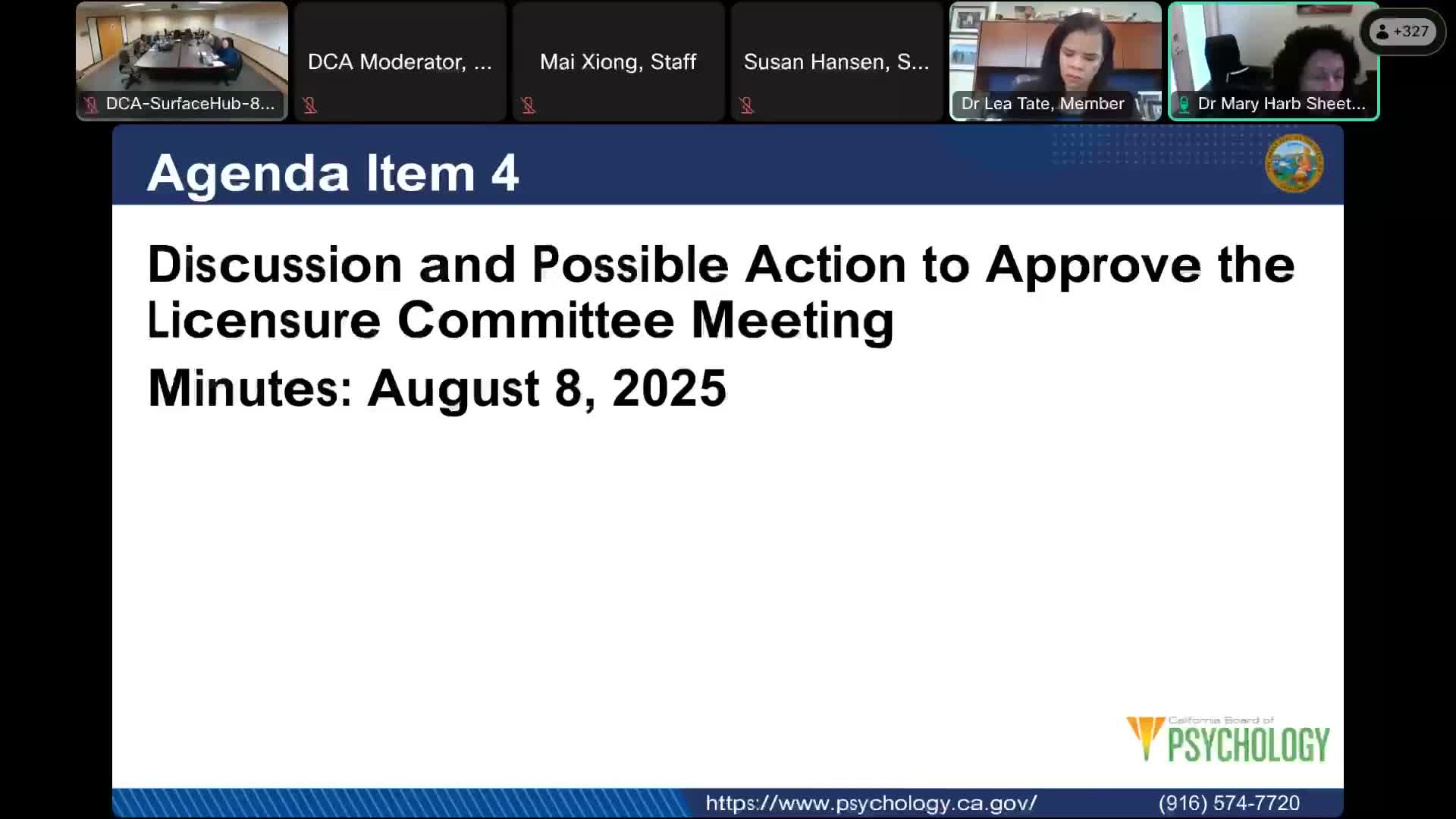 Mai Zhong, identified in the meeting as the licensing grades coordinator, summarized SB 2912 (Business and Professions Code section 2912) and said that, effective Jan. 1, 2026, out‑of‑state psychologists must receive board authorization before providing temporary psychological services in California. Zhong said the board launched a “temporary out of state psychologist 30‑day allowance” application on the Breeze portal on Jan. 6, 2026, and reported that 10 such authorizations had been approved as of the morning of the meeting. She described the current application turnaround as one to three business days and said staff expect once the process is fine‑tuned it could reach about one business day.