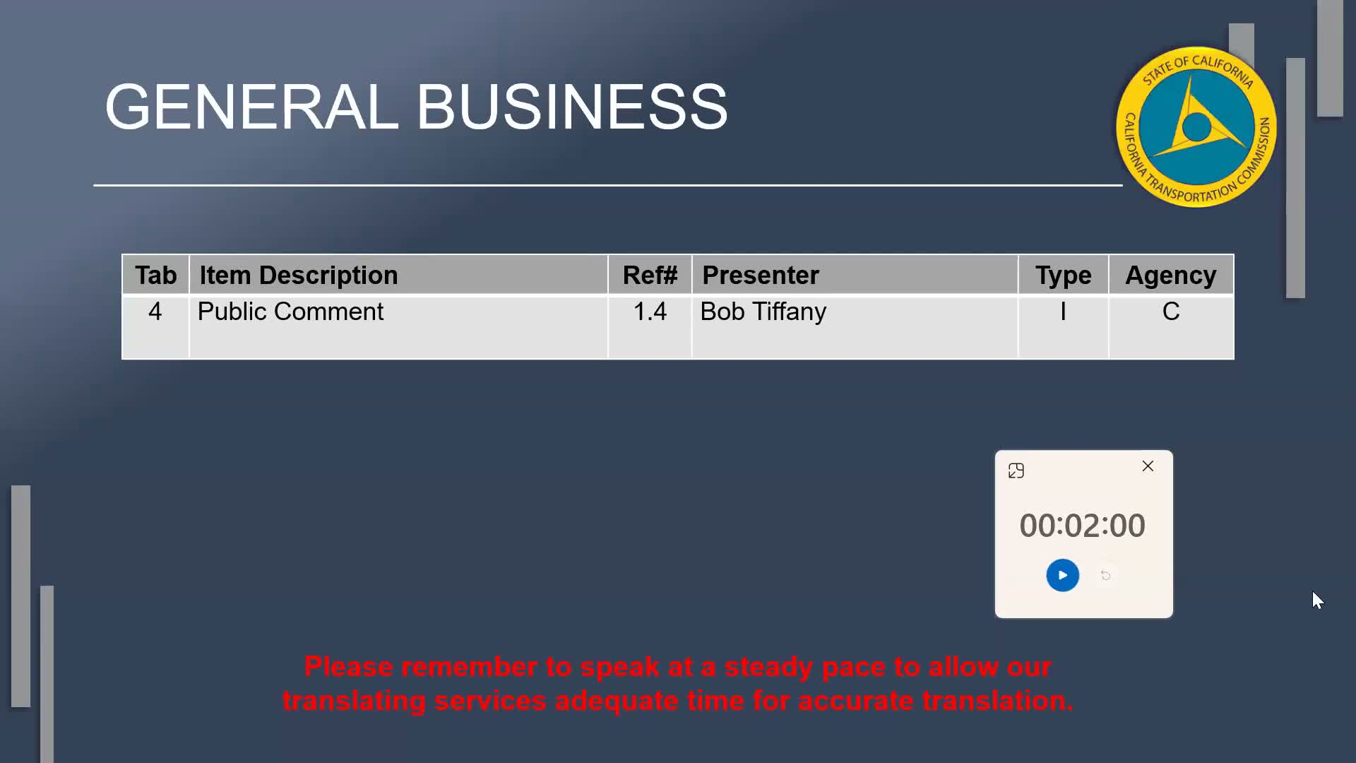 Multiple public commenters at the California Transportation Commission’s Northern SHOP hearing urged Caltrans and the commission not to delay the State Route 123 (San Pablo Avenue) pavement rehabilitation project and said the repaving includes essential safety elements.