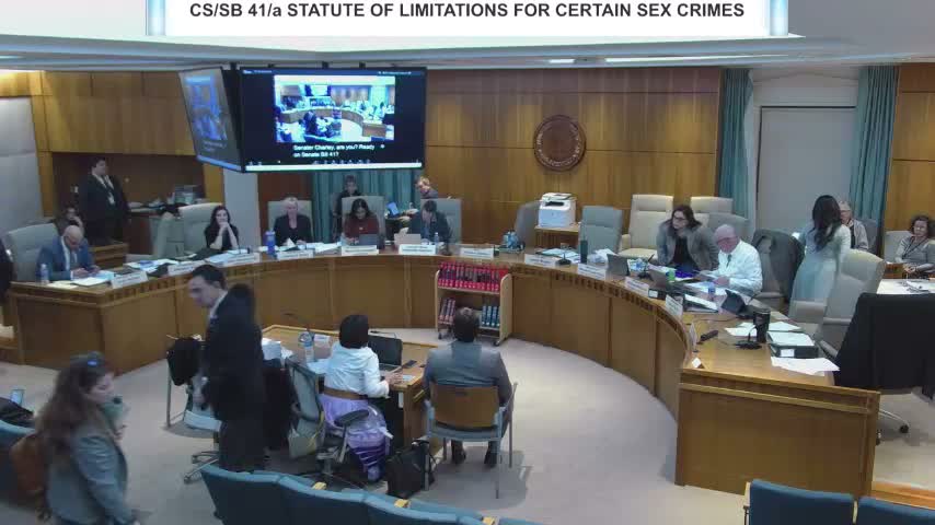 Senate Bill 41, which removes the statute of limitations for certain second‑degree sexual offenses involving minors and adds DNA provisions, passed the committee as amended after survivor advocates and victims’ advocates testified in favor; the committee approved the Senate Judiciary substitute as amended.