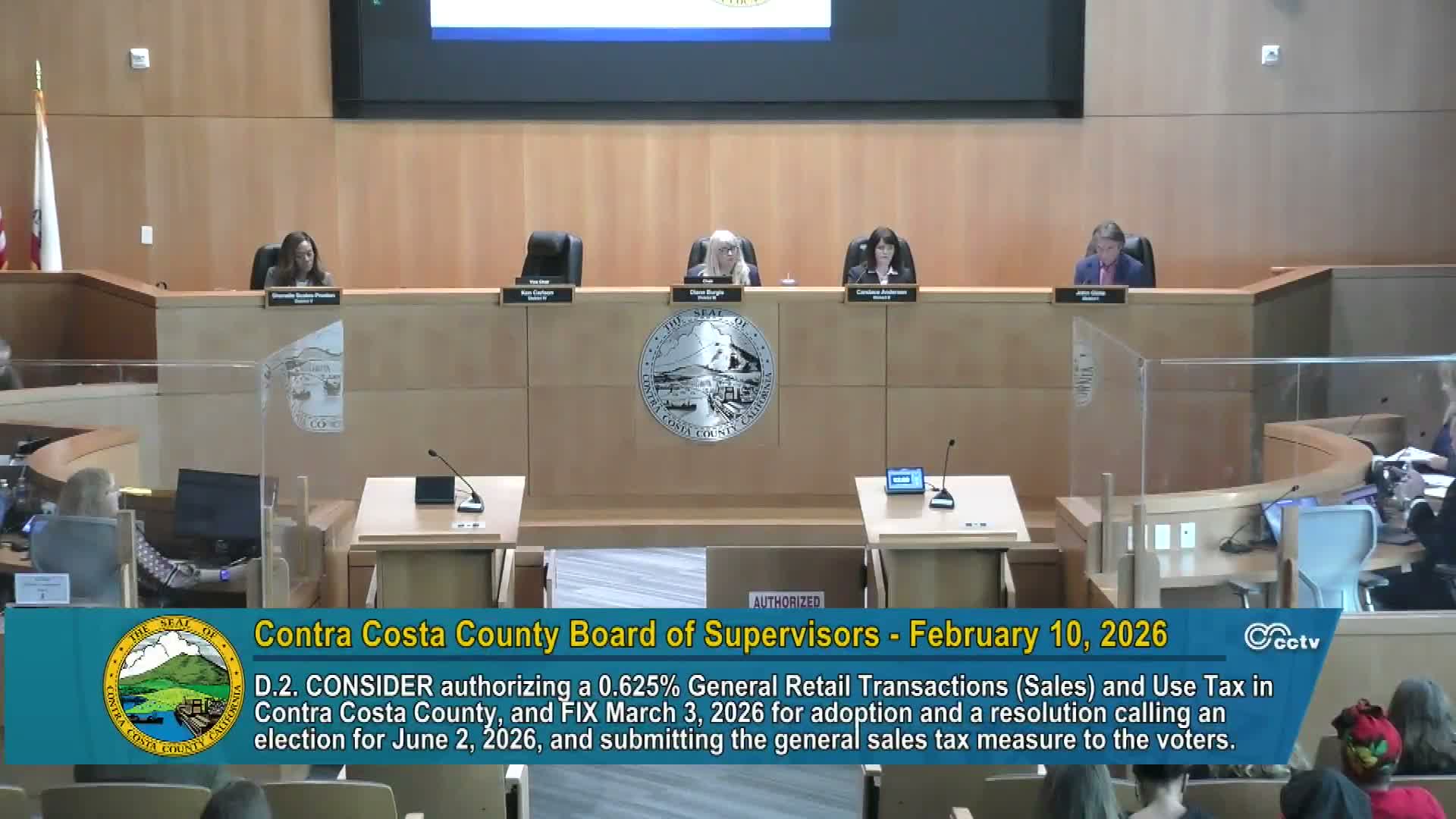 The Contra Costa County Board of Supervisors voted unanimously Feb. 10 to introduce an ordinance authorizing a 0.625% general retail transactions and use tax, and to set March 3 as the date to adopt the ordinance so it can be filed for the June 2, 2026 election.