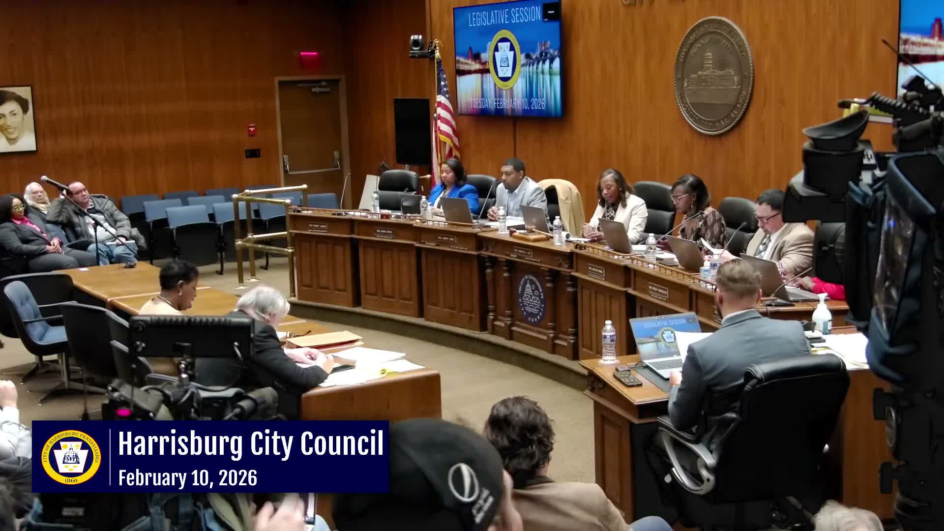 Harrisburg City Council voted unanimously (7–0) on Resolution 3 of 2026 to authorize a first 2026 budget reallocation and to roll forward certain 2025 encumbered commitments. The reallocation restores funding for three positions: the business administrator, a project manager/LERTA administrator, and a newly created director of community and economic development. The council approved an amendment to reallocate $20,000 from the general fund into council's legal-services line.