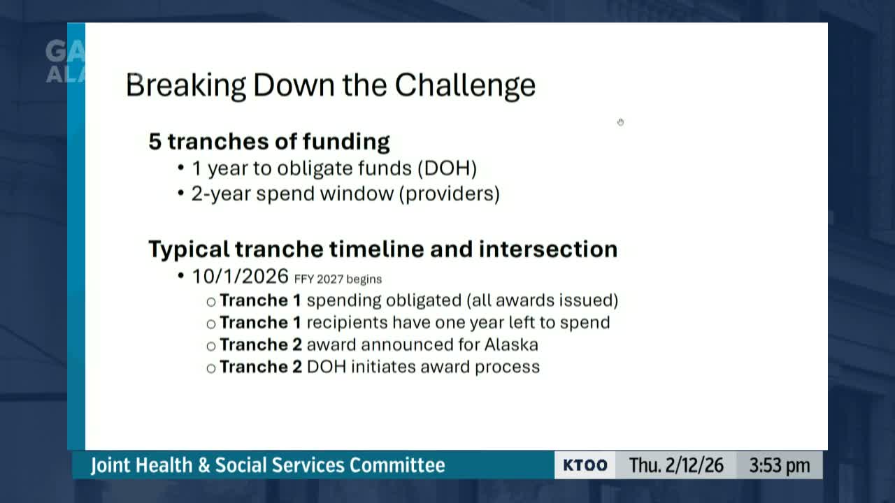 Provider representatives told lawmakers the federal tranche mechanics and short obligation/spend windows create urgent administrative challenges: Alaska must obligate roughly $272 million quickly and providers face narrow two‑year spend windows.