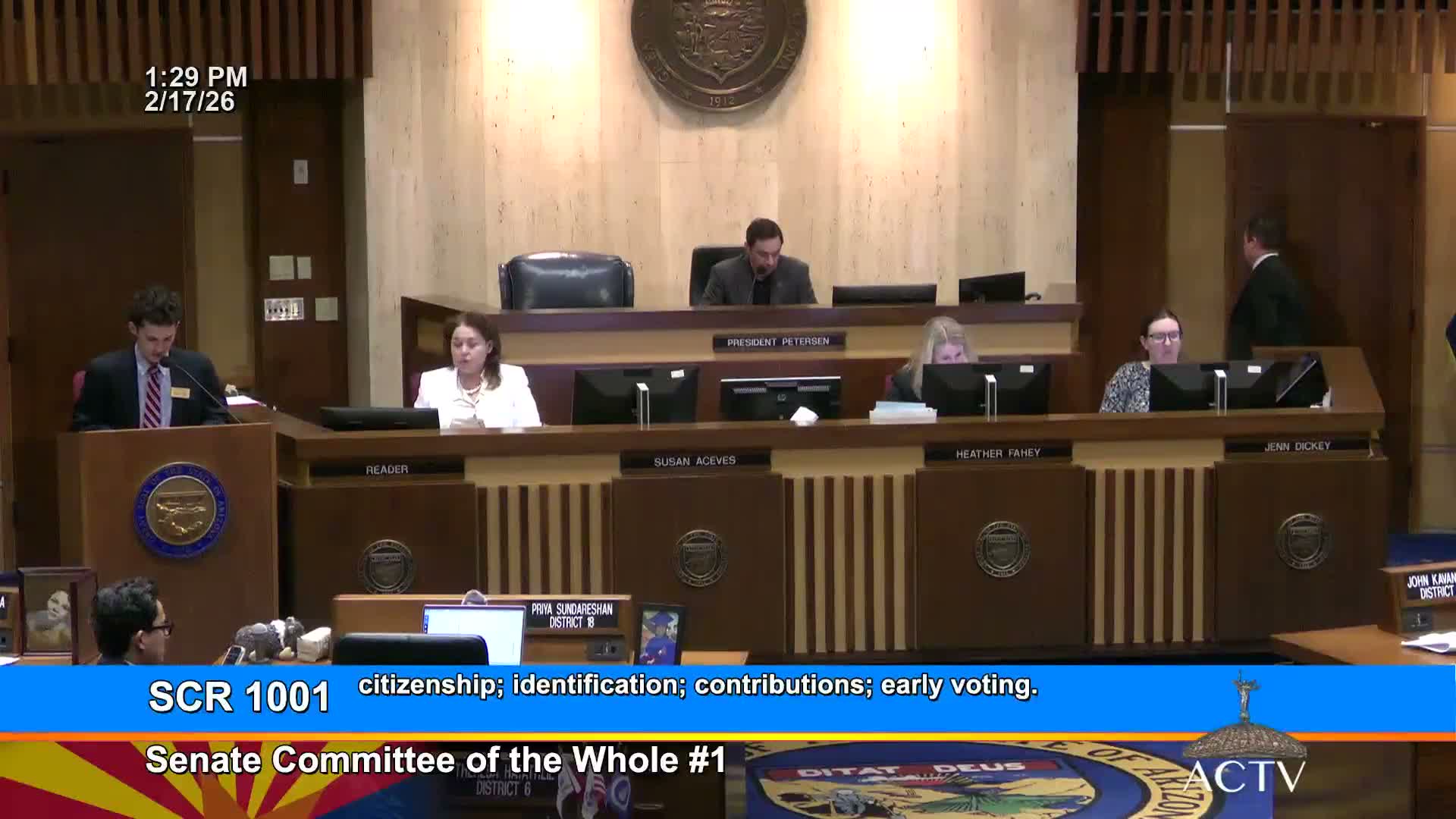 The Arizona Senate on Feb. 17 advanced SCR 1,001, a proposed constitutional amendment that would add a new section to Article 7 outlining new proof‑of‑identity and election‑administration rules, after a 17–12 vote sending the measure to the House.