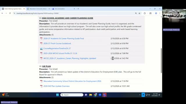 Waunakee Community School District curriculum staff presented the high‑school Academic & Career Planning (E4E) guide on Feb. 16 and briefed the committee on changes to course sequencing, honors calculations and reporting for college access programs.