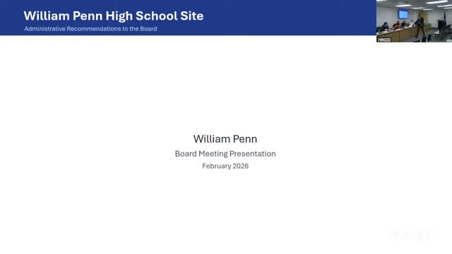 The district presented a multi‑option analysis for the William Penn property on Feb. 10, describing the building’s history (opened 1926; closed 2010; fires and vandalism since) and safety and liability concerns. Administration said renovation costs could range from approximately $13 million to $94 million and that keeping the building as is incurs about $566,000 in annual security, insurance and related costs.