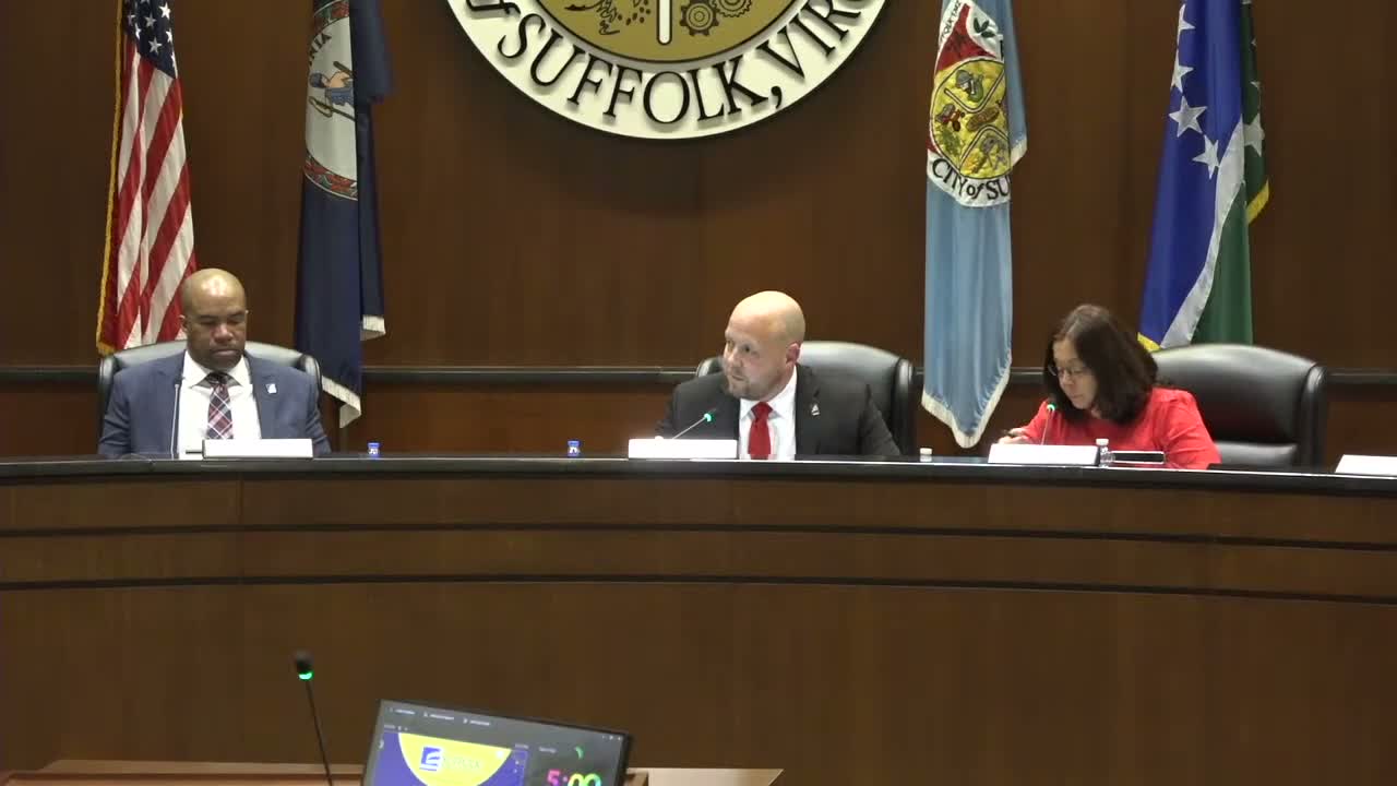 - Deed of gift (Driver property): The board voted to approve Resolution 25/26‑12 conveying the Driver property to the City of Suffolk; the motion passed. A board member raised neighborhood concerns about dust mitigation and asbestos during demolition work, and that comment was placed on the record.