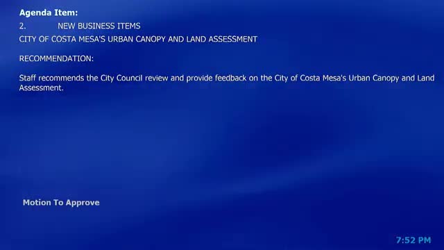 A new urban tree canopy assessment found Costa Mesa’s canopy at 13.88% (about 22,700 trees, $100M replacement value). Council directed staff to return by April 21 with existing program costs, options and ballpark estimates for growing canopy and a cost estimate for a potential master plan; motion passed 5‑1.