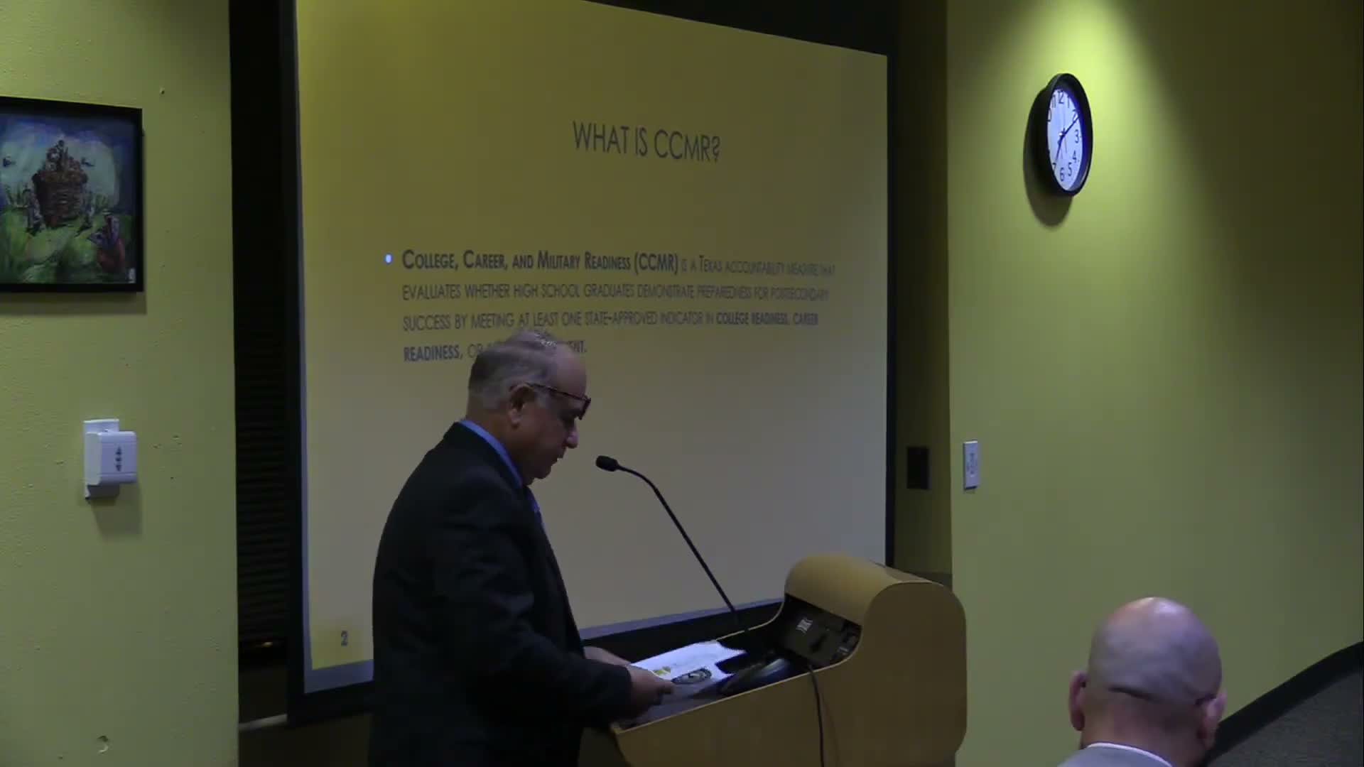 Administration presenter Leroy Garcia said CCMR — which counts college readiness, career certifications and military enlistments — is a major component of the district’s accountability measures. "CCMR is 40% of our Domain 1," he said, adding the district had “taken a 4% dip” year-over-year and must improve to recapture performance and related outcome-based funding.