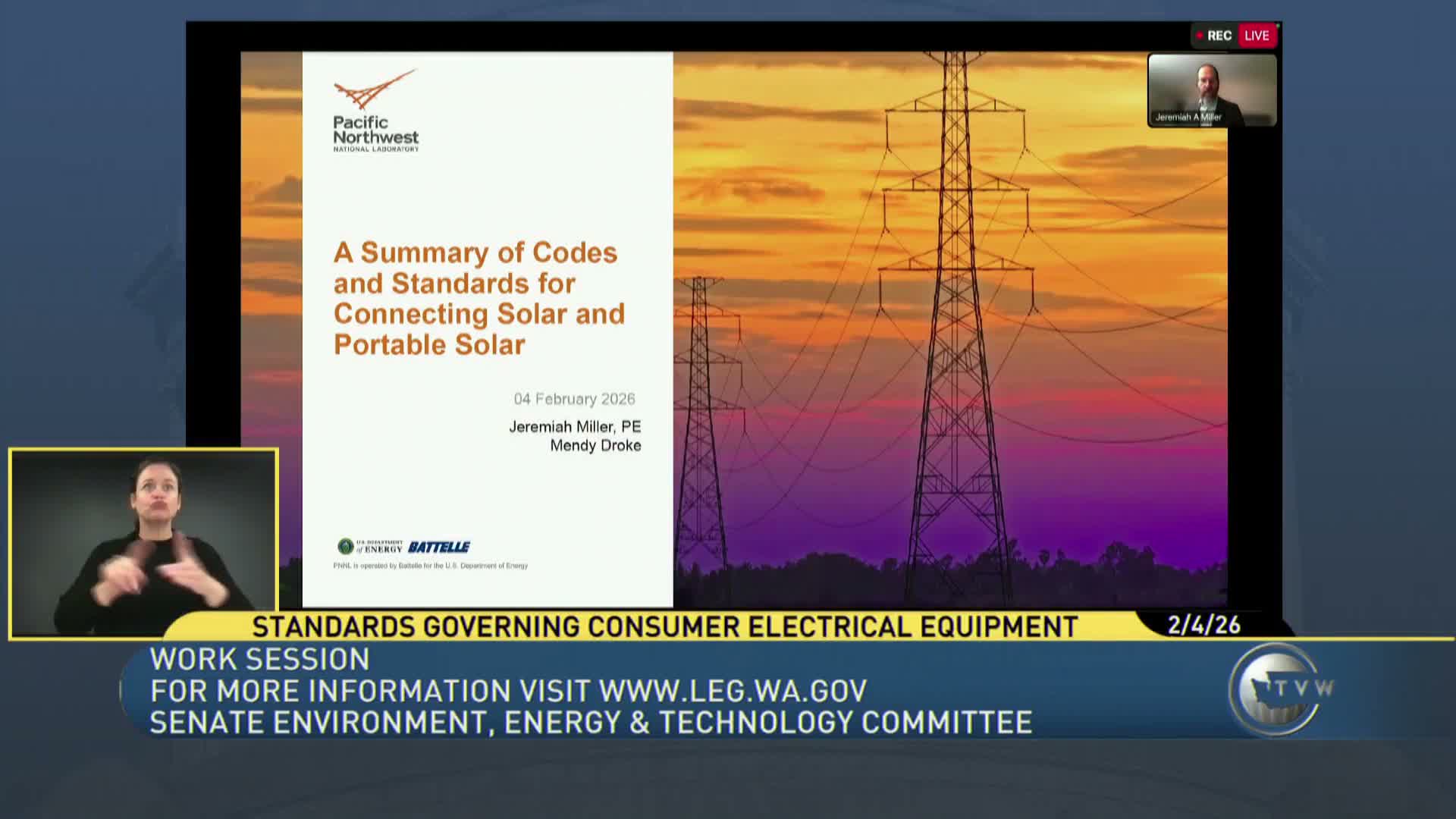A Pacific Northwest National Laboratory expert told the Environment, Energy and Technology Committee that new supplemental standards (including a recently published UL standard) are intended to enable safe plug‑in/balcony solar while NEC and other codes are revised; certification and NEC adoption timelines were discussed.