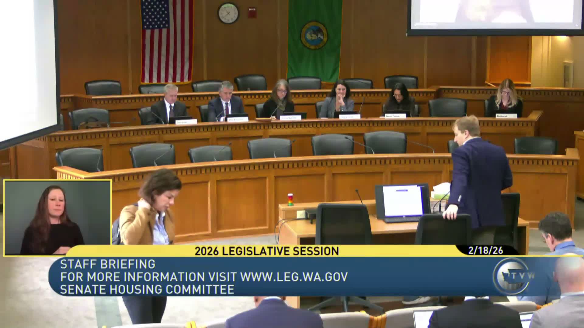 The Senate Housing Committee on Feb. 18 heard Substitute House Bill 2269, which clarifies whether 'existing sewer systems' can include large on‑site sewage systems for middle‑housing developments in rural unincorporated areas.