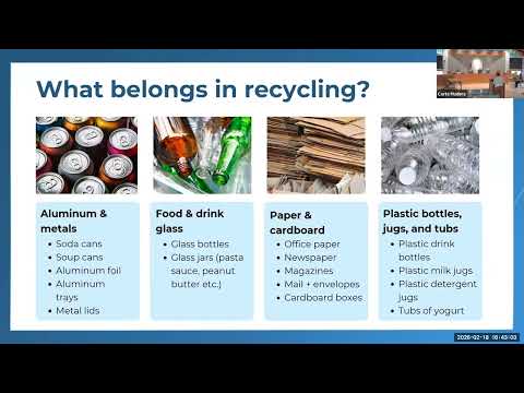 Fritz reviewed recycling and compost rules: metal cans and single‑use glass belong in recycling; tempered glass such as windows and Pyrex does not; plastic recyclability is driven more by shape (bottles, jugs, tubs) than by resin codes; and all food scraps (including bones and eggshells) and soiled unlined paper should go in the green bin for composting. She warned that compostable plastics and many bioplastics are not accepted at the county's certified‑organic compost facility; accepting them would risk losing certification and they frequently fail to break down.