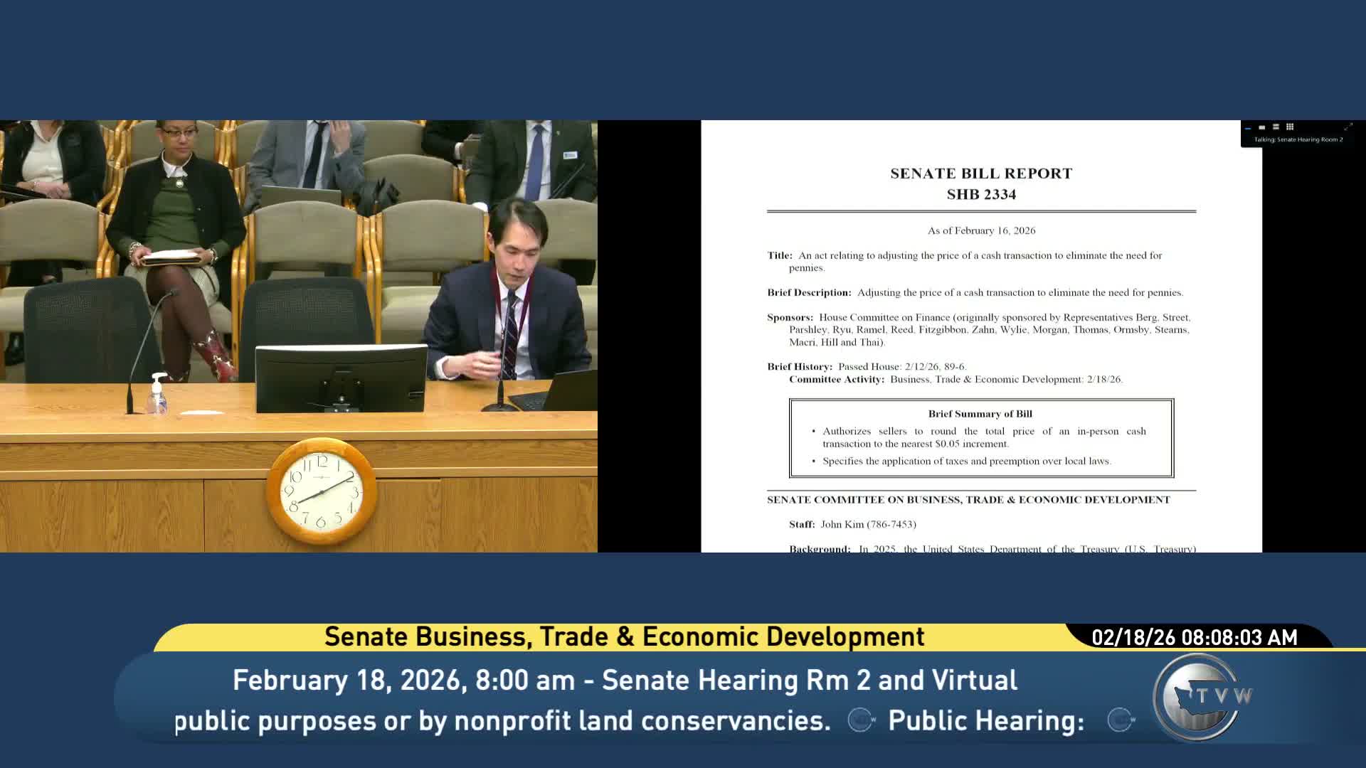 The Senate Business, Trade and Economic Development Committee heard Substitute House Bill 2334 on Feb. 18, a bill that would permit sellers to round in‑person cash transactions to eliminate reliance on pennies. Committee staff explained the rounding method: totals ending in 1¢, 2¢, 6¢ and 7¢ would be rounded down; totals ending in 3¢, 4¢, 8¢ and 9¢ would be rounded up. Rounding would be applied after sales and use tax so the tax owed is not changed.