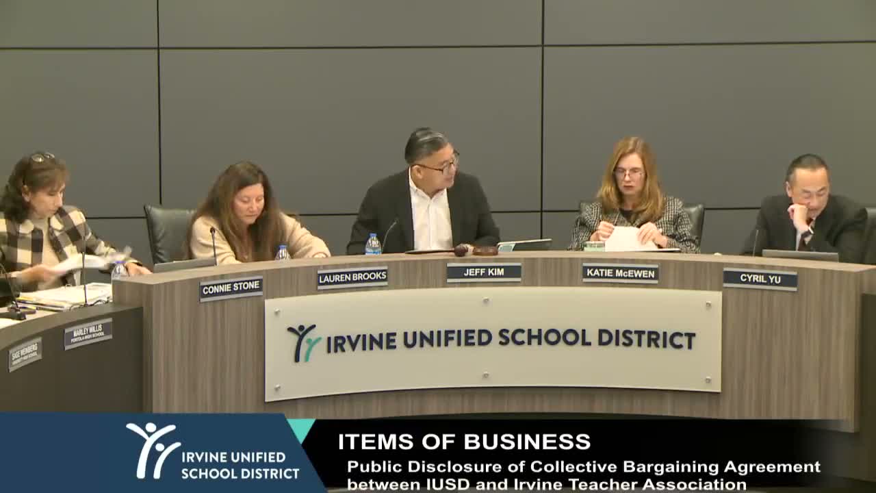 The board ratified the Irvine Teachers Association tentative agreement and approved parallel settlements for the Irvine Supervisory Association, Irvine Administrative Assistance to the Principal, and the Irvine Administrators Association. ITA President Jess Bracken thanked negotiators and reported a favorable member vote (90.3% in favor) on the proposed settlement.