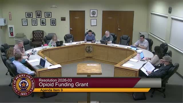The Perry City Council unanimously approved Resolution 2026-03 to apply for opioid-settlement grant funding to place two outreach workers in Noble County/Perry through Grand Mental Health. The three-year program would be managed by Grand Mental Health; staff will return with reimbursement and contract details.