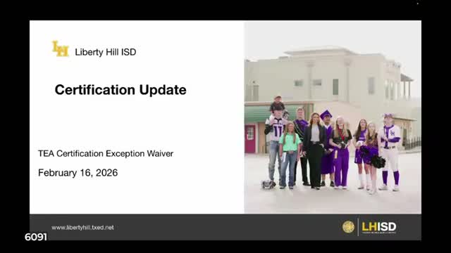 The Liberty Hill ISD board voted Feb. 16 to seek a delay/exemption from the Texas Education Agency’s full certification timelines so the district can retain teachers who are locally vetted while they complete state certification requirements.