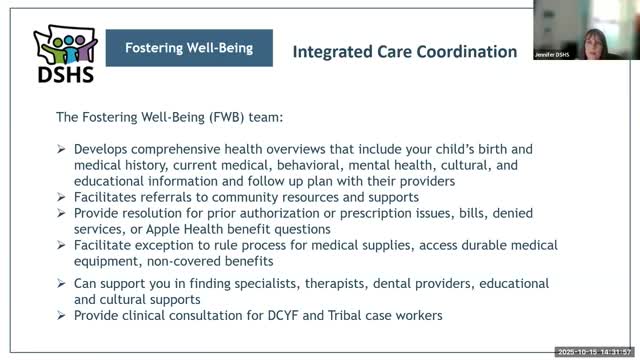 Fostering Well‑Being and Coordinated Care said they provide integrated care coordination, clinical consultation and referral support for children and youth in out‑of‑home placement. Jennifer Heeb of DSHS described how Fostering Well‑Being develops a comprehensive health overview for each child and works with caregivers and clinicians to identify gaps, resolve prior‑authorization issues and arrange specialist referrals. "Fostering Well‑Being provides integrated care coordination for each child, and we develop a comprehensive health overview in collaboration with our clinical staff," Heeb said.