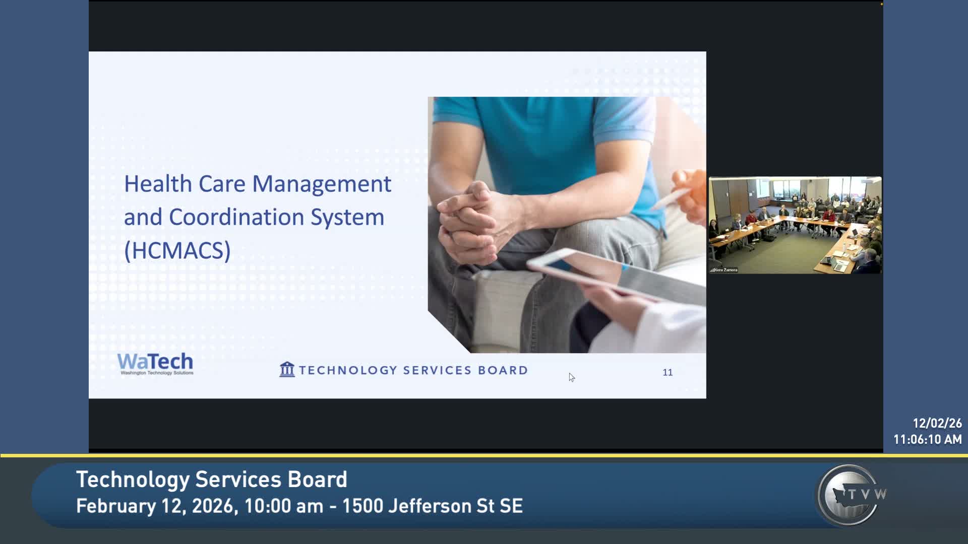 WATEC oversight staff and agency leaders told the Technology Services Board that the state's enterprise electronic health record initiative, described in materials variously as HC Max / HCMACS, is at elevated risk because of system integrator procurement delays, schedule realignment pressures and uncertain federal funding.