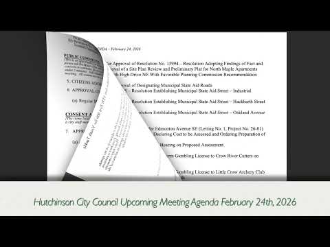 City Administrator Matt Yannick on Friday outlined the Hutchinson City Council agenda for Tuesday, Feb. 24, 2026, saying the meeting will include two donation resolutions for Parks & Recreation, several internal fund transfers, a site plan review for a proposed apartment project, and a public hearing on downtown site improvements.
