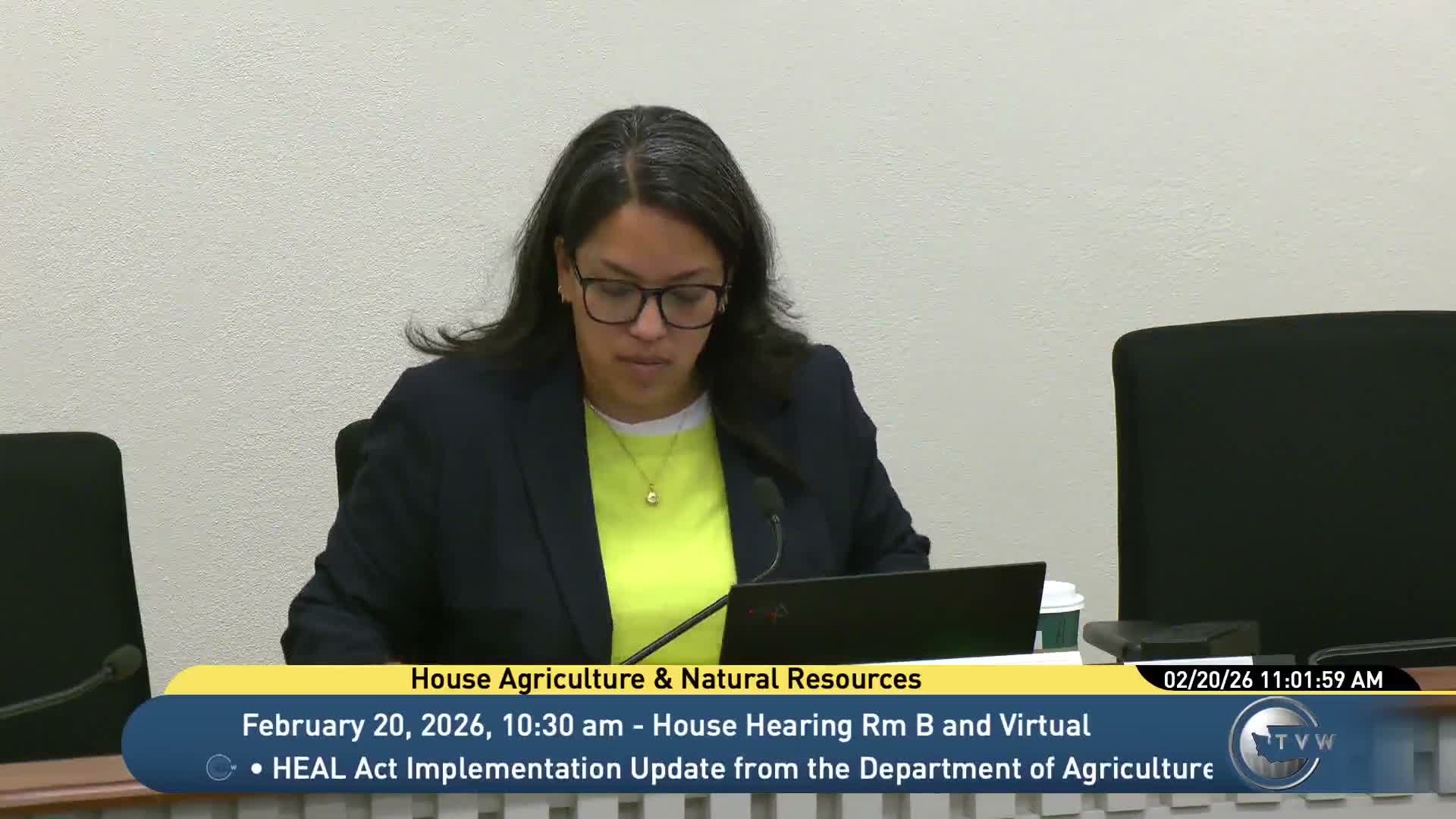 Nicole Johnson, WSDA's director of equity and environmental justice, told the House Agriculture and Natural Resources Committee that WSDA has completed 11 environmental justice assessments, is conducting EJAs for four rules in development, and currently staffs HEAL implementation with roughly 1.5 full‑time equivalents, a constraint the agency says limits outreach time and data quality.