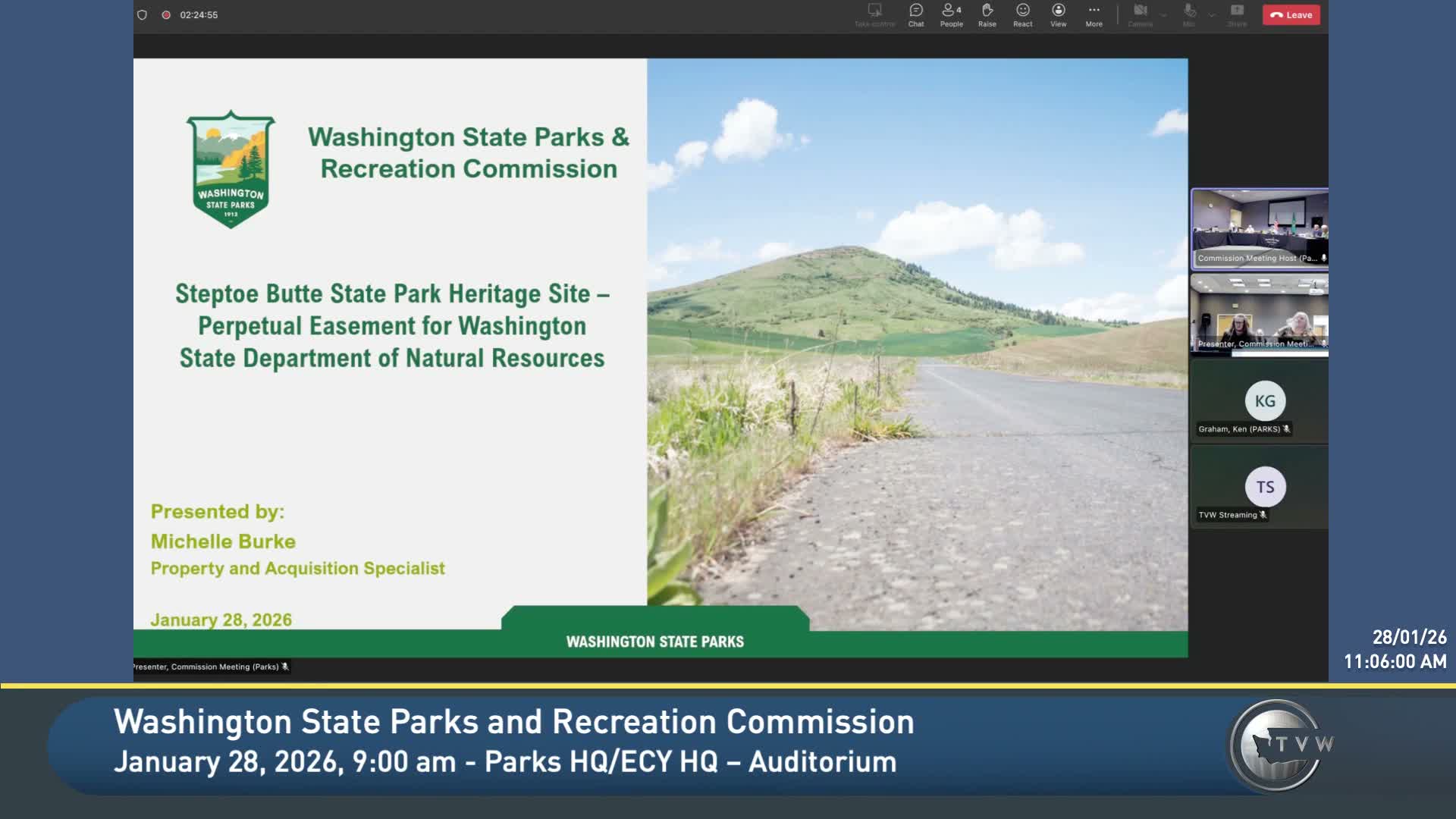 Michelle Burke, property and acquisition specialist, told the commission that the Washington State Department of Natural Resources has requested a perpetual road easement across Steptoe Butte State Park to provide legal access to DNR's adjacent conservation lands and satisfy Recreation and Conservation Office (RCO) grant requirements.
