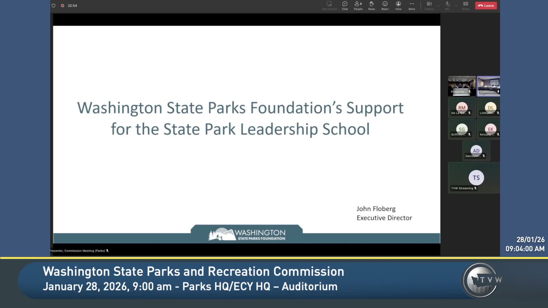Washington State Parks officials and alumni described the agency's new ongoing participation in the National Association of State Park Directors leadership school, crediting the Parks Foundation and small grants for covering tuition and travel and framing the program as a tool for succession planning and retention.