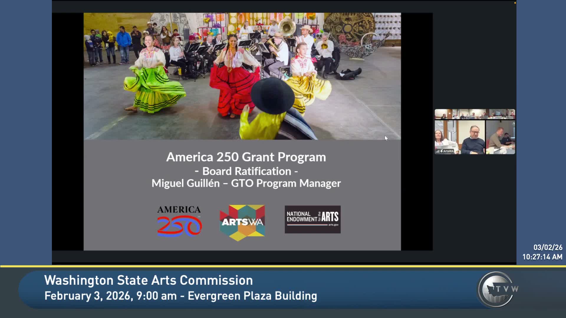 The Washington State Arts Commission voted to ratify two rounds of small project grants on Feb. 20: $27,000 for America250 commemorative projects and $21,000 for the Cultivating Healthy Communities pilot focused on arts-based health and well-being in rural communities.