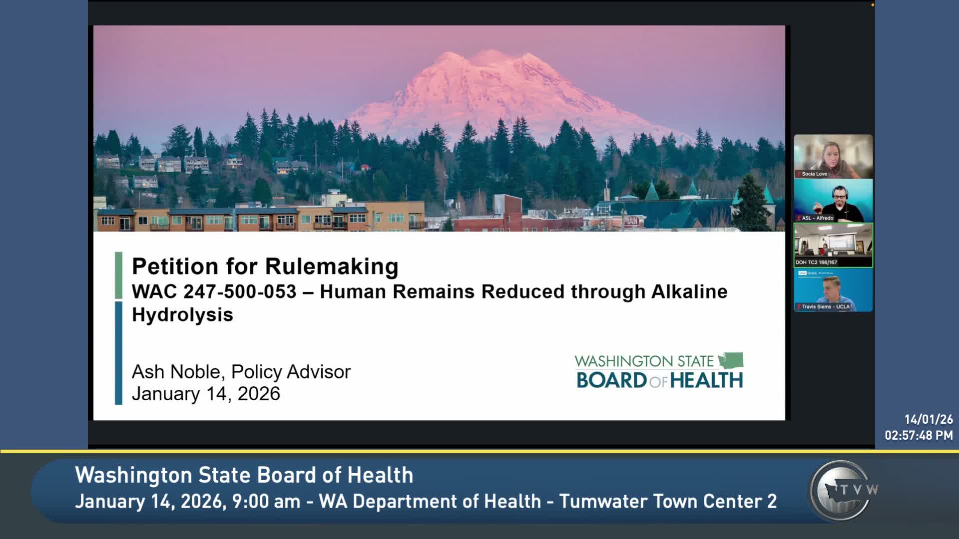 The Washington State Board of Health on Jan. 13 declined petitions that sought a temporary moratorium on alkaline hydrolysis, restrictions on discharge of process effluent to wastewater systems, and limitations on application of biosolids derived from treated effluent, citing existing board rules that require validation that reduction processes achieve sterilization and prion destruction.
