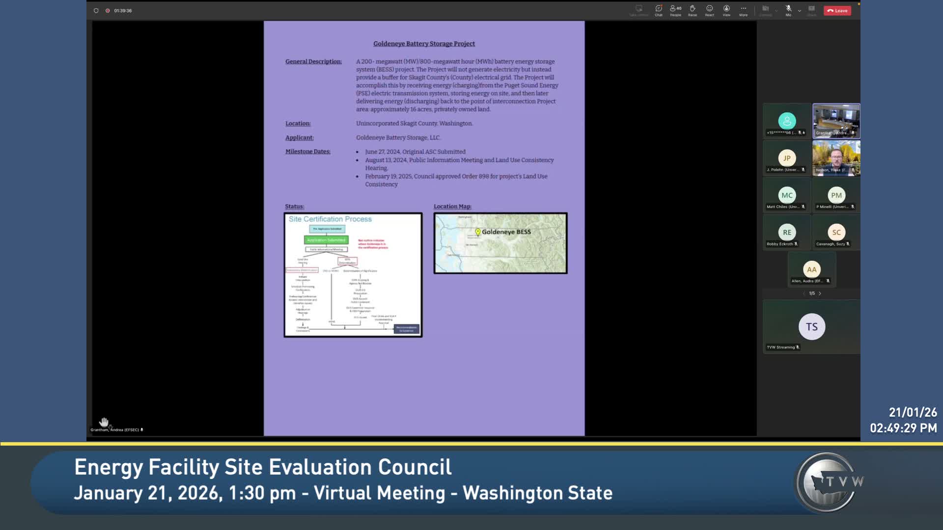 Maria Belkina, siting specialist assigned to the transmission application, said staff are preparing consolidated data requests, expecting agency comments and working to sequence Section 401 water‑quality certification after a sufficiently developed SEPA environmental record. She also said initial government‑to‑government consultations with tribes are scheduled to start in early February and that staff have engaged local jurisdictions along the proposed route to ensure they appoint council members where required.