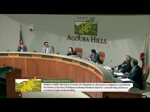 The Agoura Hills Planning Commission on Feb. 19 approved a conditional use permit and site plan/architectural review to allow a 1,072‑square‑foot second‑story addition to an existing single‑family residence at 5748 Kolotny Drive.
