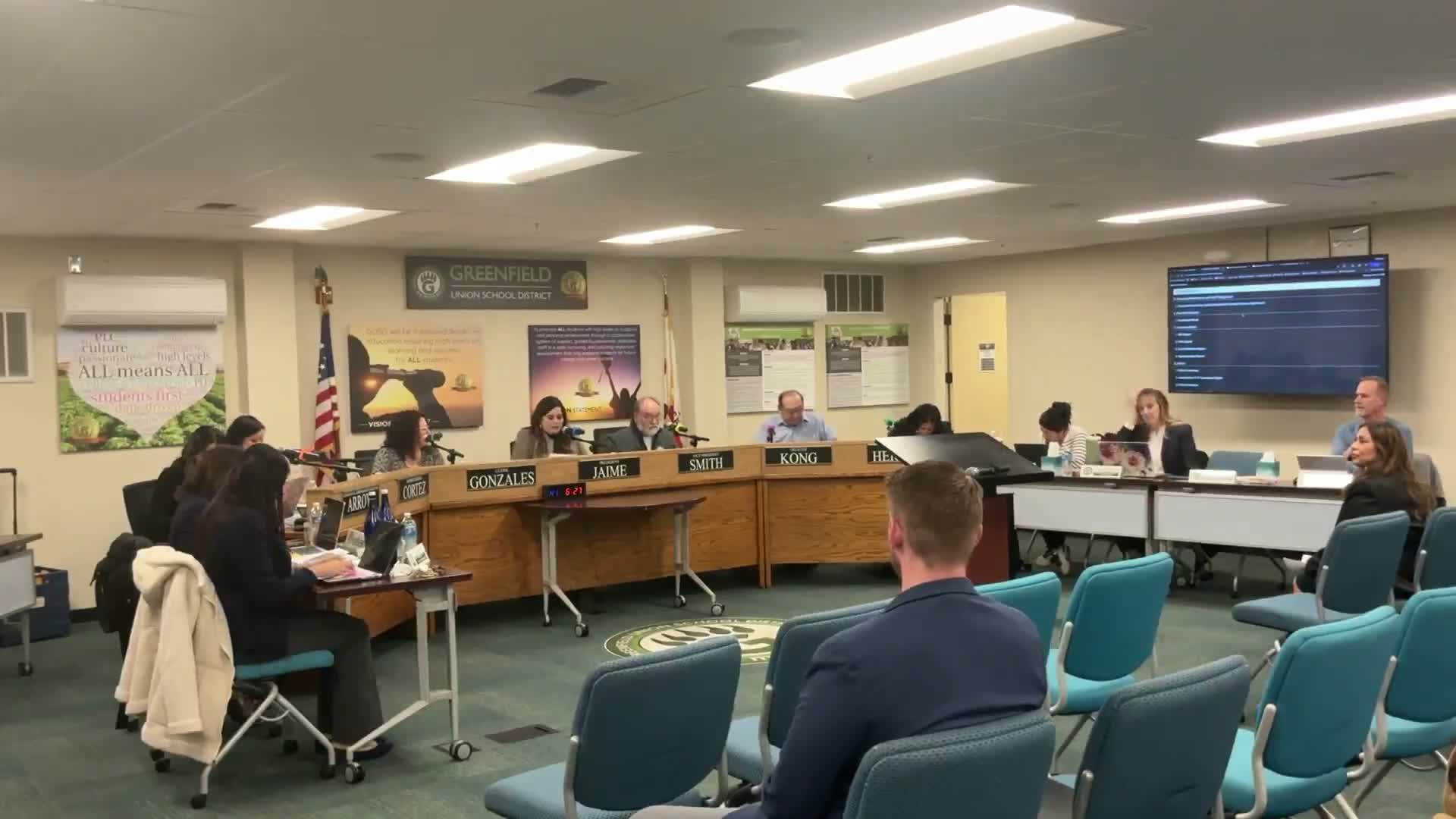 The board paused to recognize staff. Vasquez introduced school psychologist Joe Bello, honored for 11 years with the district, and staff member Diego for his dedication to students. Bello told trustees he considers Greenfield Unified home and praised the district’s collaborative leadership. Vice President Smith added personal praise for the department’s patience and work, noting his own experience as a parent of an adult child with special needs.