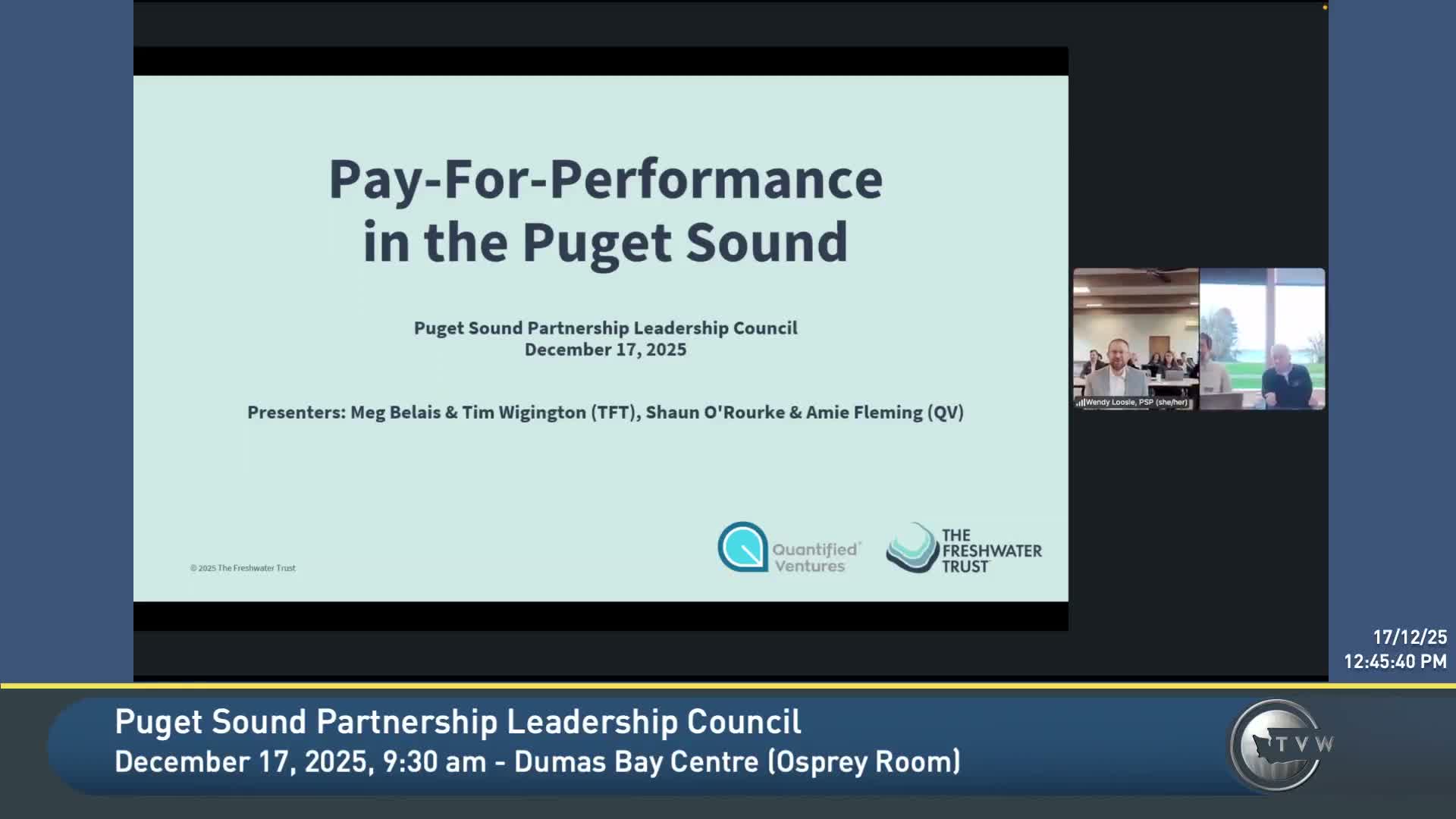 Freshwater Trust and partners outlined a pay‑for‑performance pilot that would pay for quantified restoration outcomes, propose model RFPs for four restoration actions, and recommend using a Puget Sound recovery account or an outcomes bank to aggregate funding and speed projects.