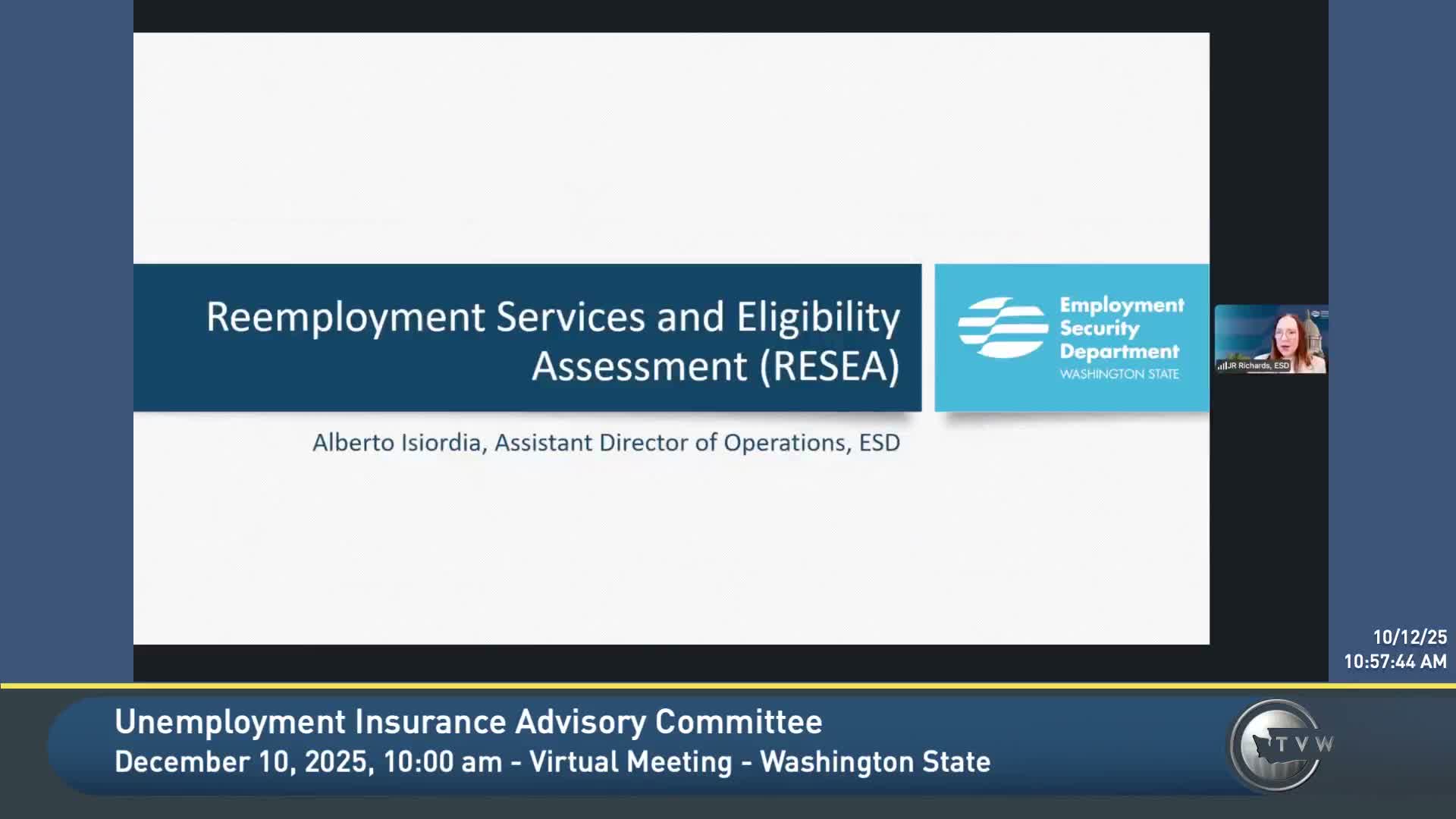 The Employment Security Department told the Unemployment Insurance Advisory Committee Dec. 10 that its RESEA (Reemployment Services and Eligibility Assessment) program reduces claim durations and strengthens program integrity, and that federal rules increasingly require evidence-based interventions.