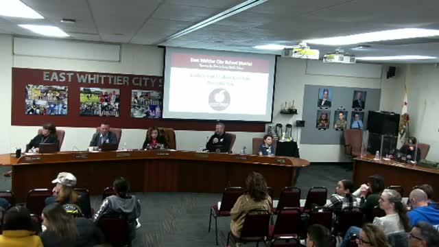 East Whittier assistant superintendents and curriculum staff presented midyear LCAP expenditures through December, implementation status and student achievement trends showing steady ELA, mixed math results and ELPAC gains; trustees requested more granular D vs. F and subgroup data.