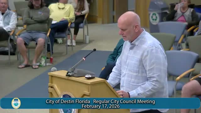 Citizens urged the city to resolve stormwater damage, remove temporary parking barriers near Destin Elementary, review an $82,000 code enforcement lien, and addressed ongoing litigation and mediation over beach vendor enforcement; the council announced two executive sessions and staff said mediations are confidential but enforcement continues.