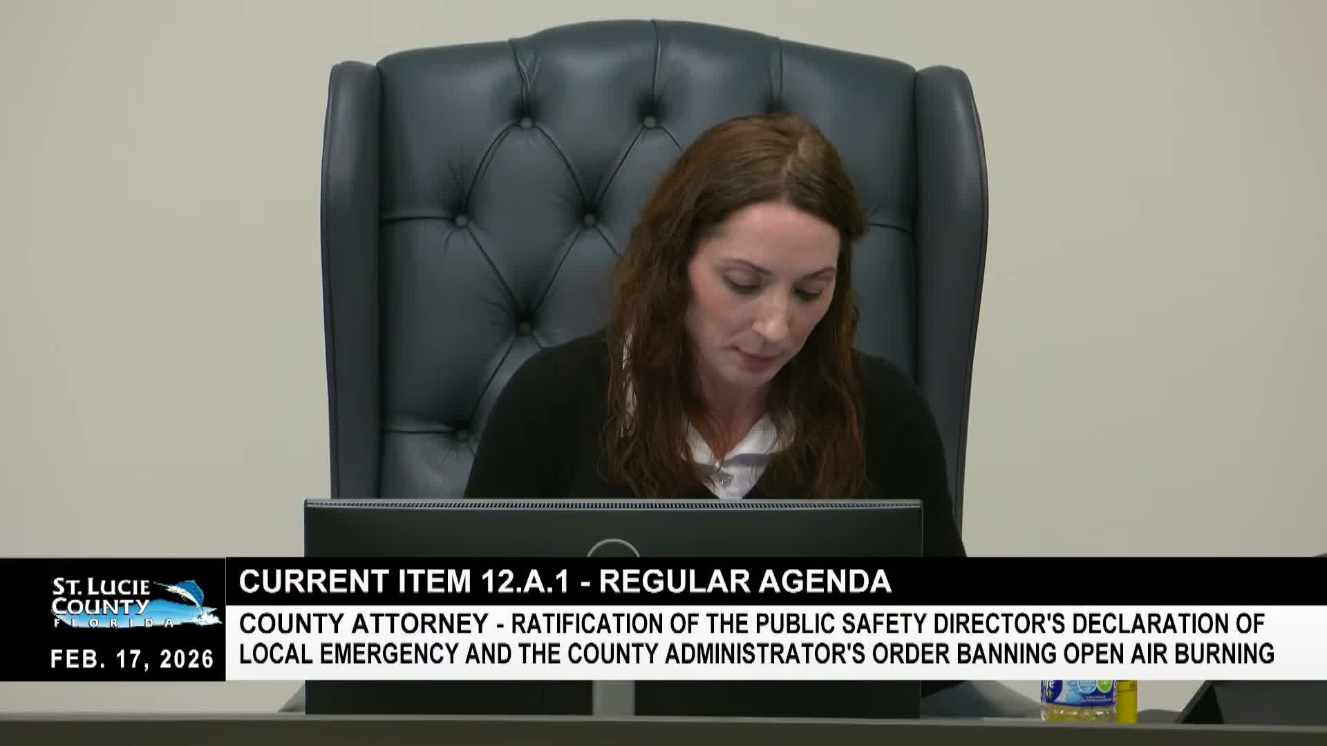 The St. Lucie County Board of County Commissioners voted to ratify a local emergency declared by the public safety director and approved an administrative order banning open‑air burning due to drought conditions.