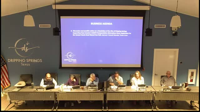 Dripping Springs council approved a resolution supporting Hays County’s CAMPO Transportation Alternatives Set‑Aside grant application to fund a 1.3‑mile, 10‑foot shared‑use path on Sawyer Ranch Road; estimated construction cost $2.9 million with the county requesting up to $2.32 million in grant funds and providing the remaining match.