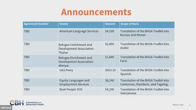 Chair Rowlett also announced termination of agreement MHSOAC022 with the University of the Pacific, originally valued at $5,000,000; remaining funds from that agreement will revert to the Behavioral Health Services Fund. Earlier in the meeting the committee also approved six small translation agreements to translate the BHSA stakeholder planning toolkit into multiple languages (examples cited in materials: $4,539 to American Language Services for Korean; $8,240 to Equity Languages and Employment Services for Cantonese, Mandarin and Tagalog; $4,200 to Both People SOS for Vietnamese).