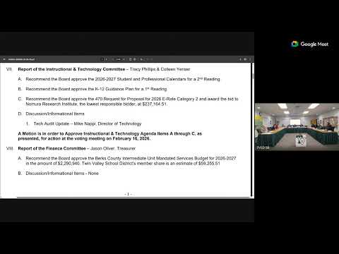 At the Feb. 9 meeting the Twin Valley School District board reviewed the K–12 guidance plan (the 339 plan) and governance policies and agreed to move the items forward for final action next week. Staff described the guidance plan as a roughly 30-page document required by the Pennsylvania Department of Education to be submitted by March 31 and said it includes career guidance resources and counseling/mental-health elements; staff invited board members to submit questions by email.