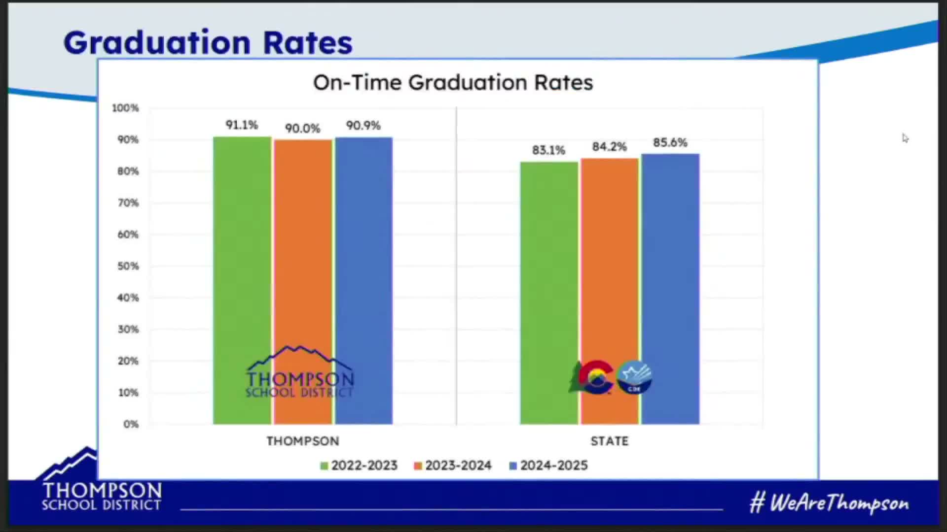 Thompson School District officials told the board on Feb. 18 that the district’s 2025 on‑time graduation rate was 90.9%, outperforming the state rate of 85.6%, and that the district’s overall dropout rate for grades 7–12 was 1% compared with 1.6% statewide.