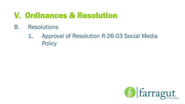 The Farragut Board of Mayor and Aldermen approved an amended social‑media policy (Resolution R26‑03) by a 3–1 vote on Feb. 12, ending hours of public comment and debate about how town‑sponsored platforms should be moderated.