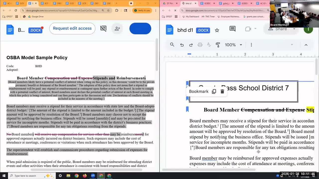 Grants Pass SD 7 board members used the workshop portion of their meeting to debate several governance items including potential board compensation, travel and meal reimbursements, and how to better align budget policy to the district strategic plan.